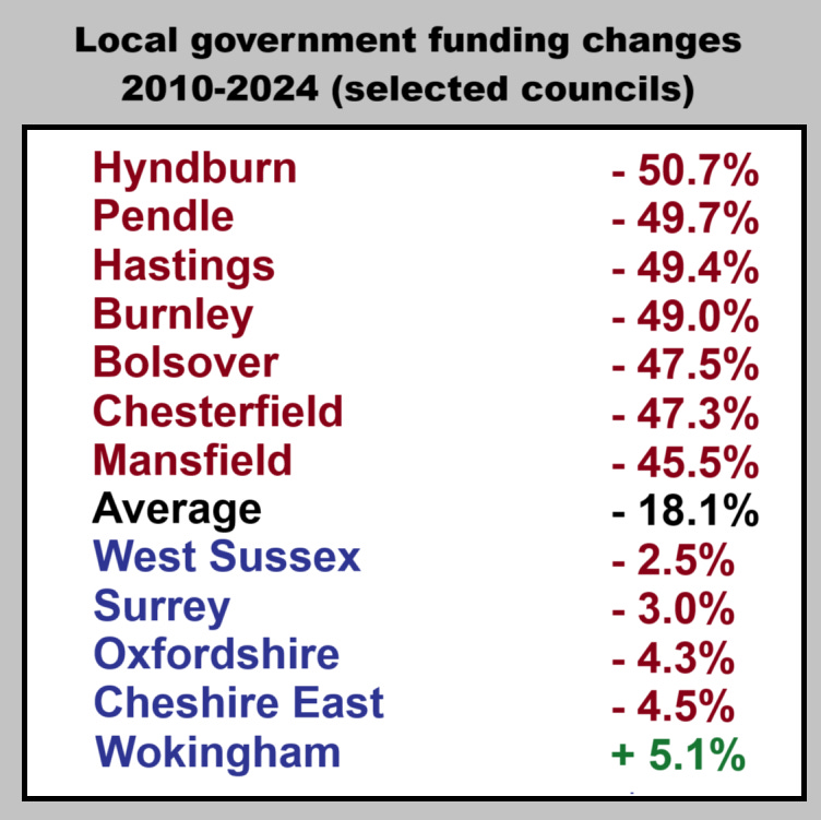 According to the Special Interest Group of Municipal Authorities (SIGOMA), between 2010 and 2024 the Tories slashed £13.9 billion from local government funding, with the heaviest cuts aimed at London and deprived urban and post-industrial (Labour voting) areas, while several wealthy (Tory voting) areas were hit with relatively tiny funding cuts in comparison, while Wokingham even got a nice little increase.